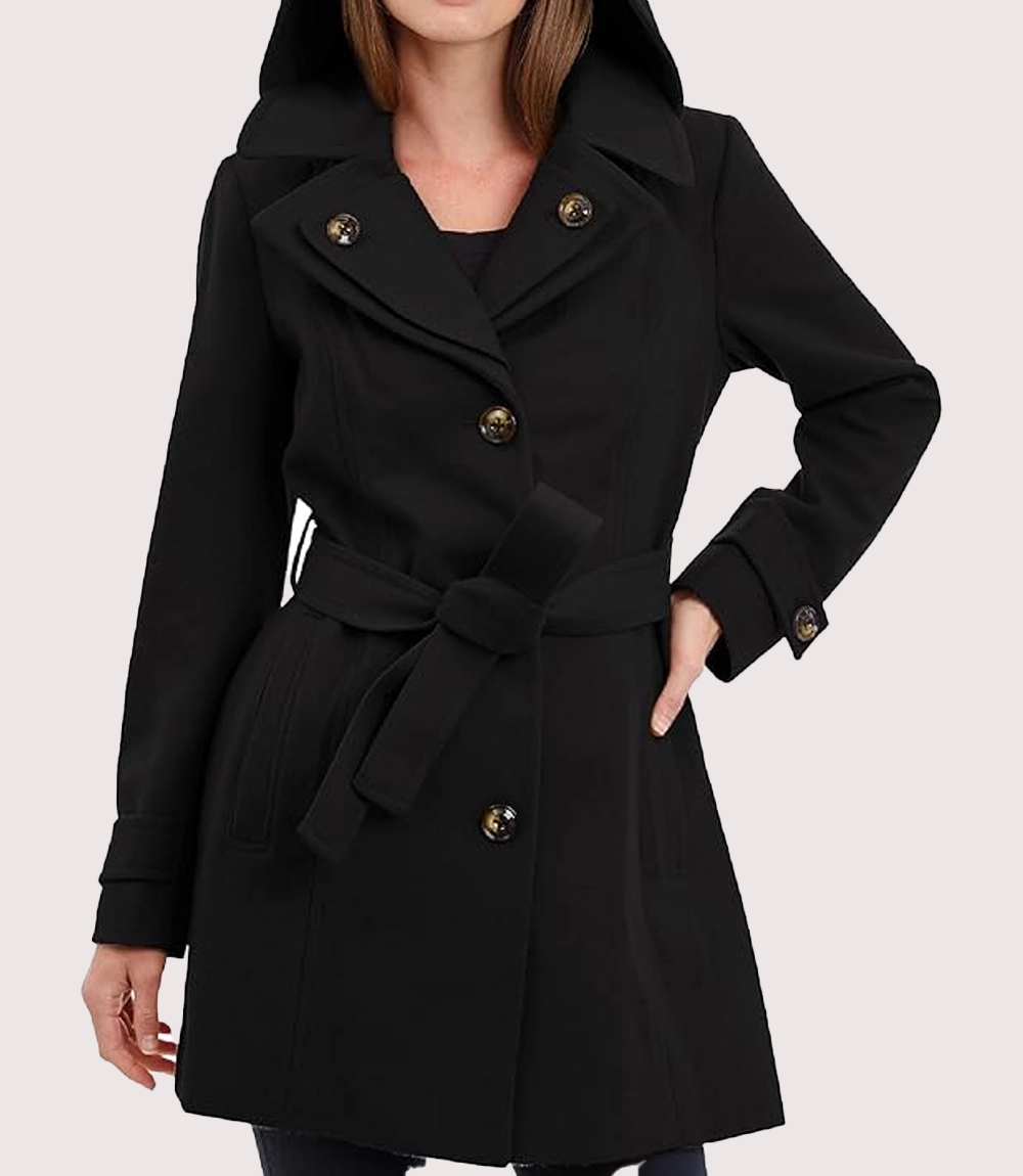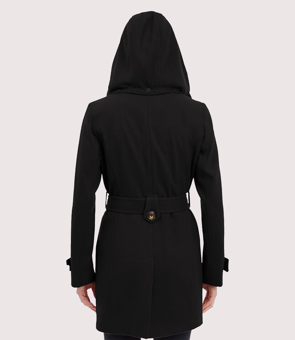 Women’s Wool Blend Black Trench Coat With Removable Hood